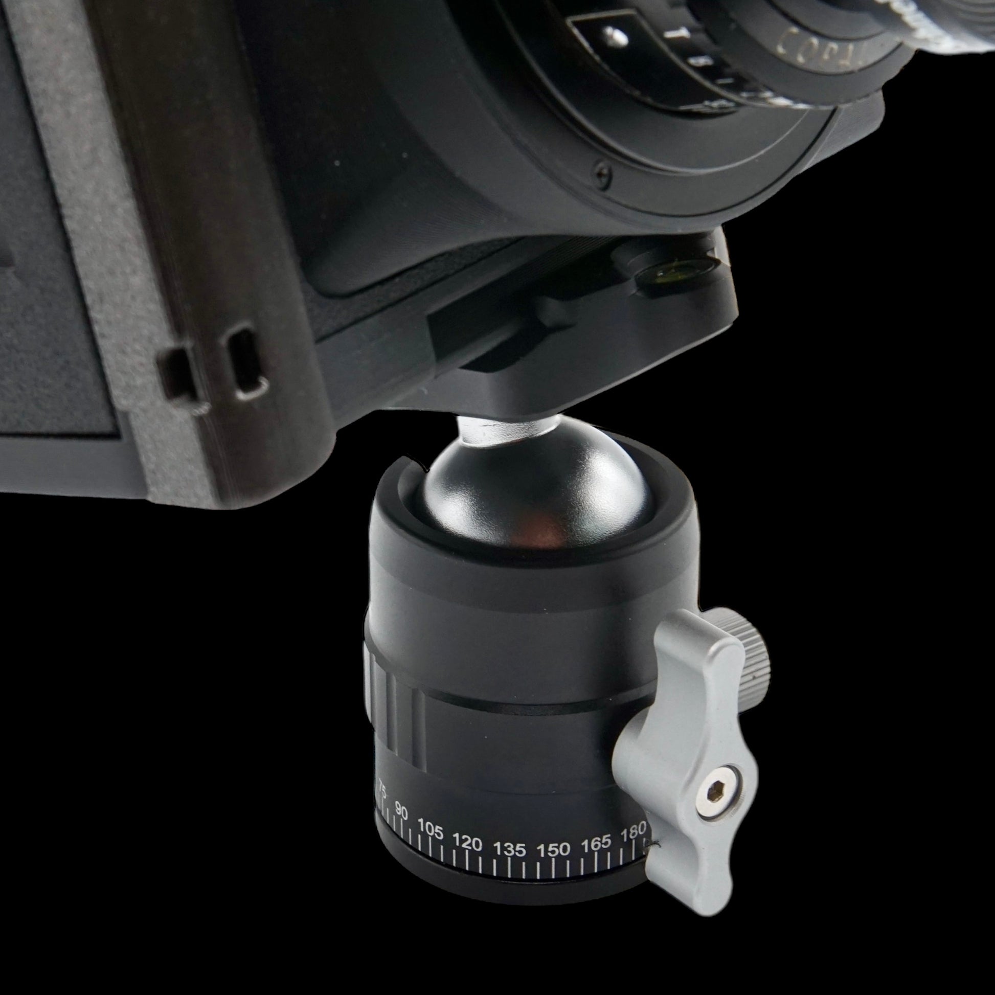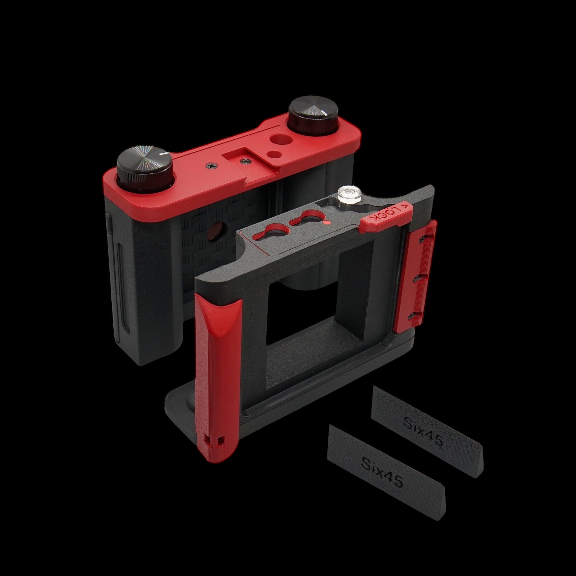 The main camera body has an embedded bubble level in the top centre, to aid composition when focusing on the ground glass, the level is also visible when the film back is fitted to provide the same composition aid when using the camera with zone focusing.
